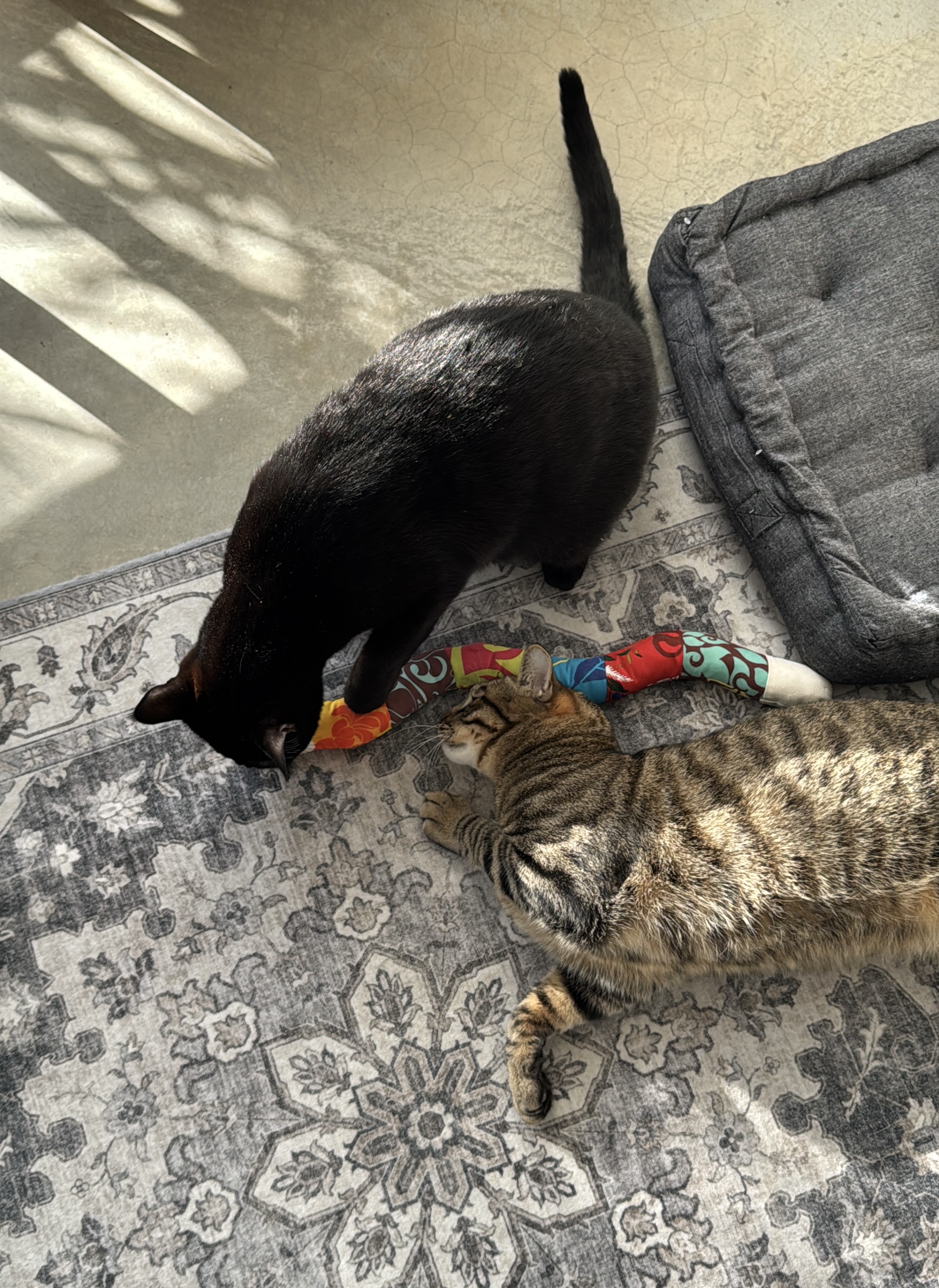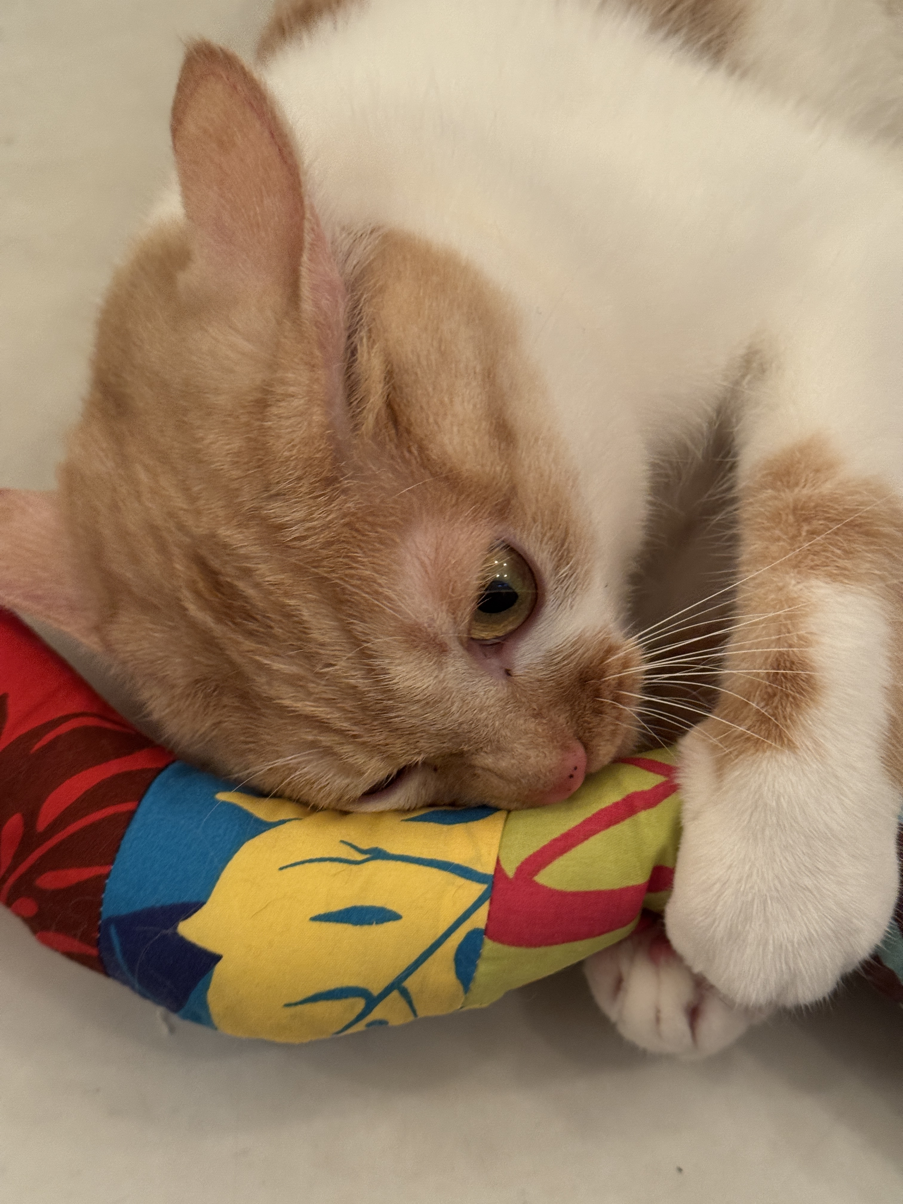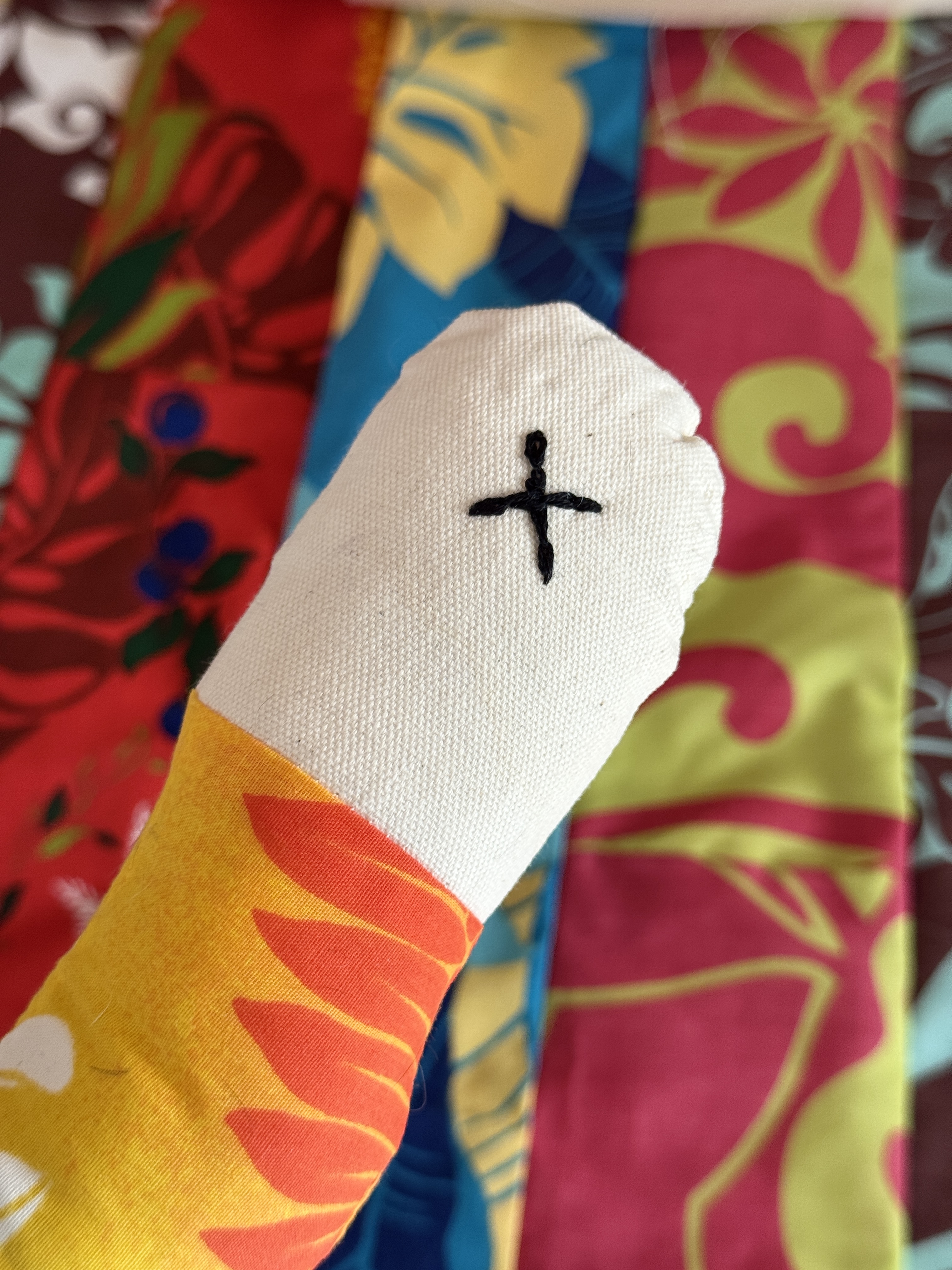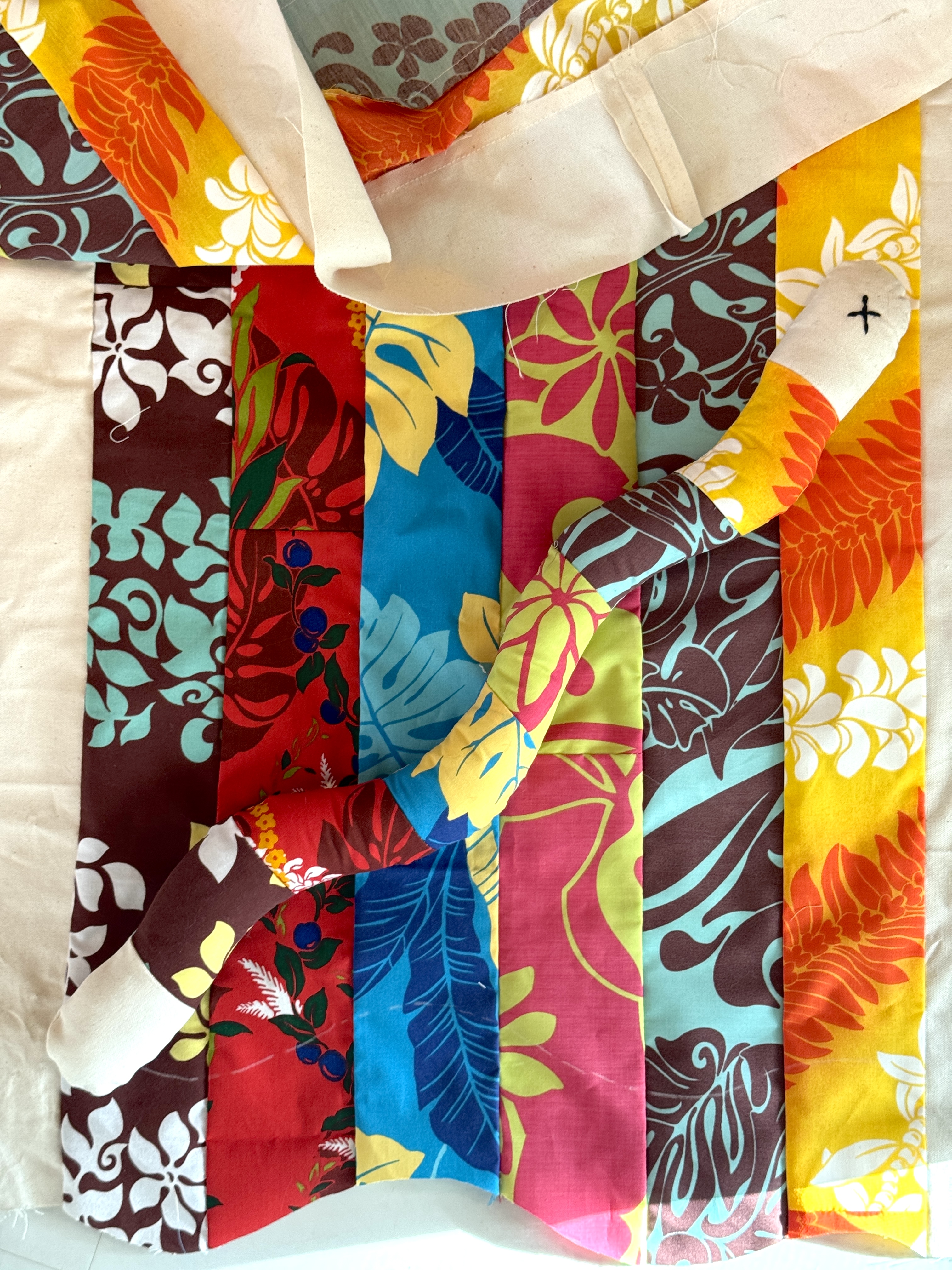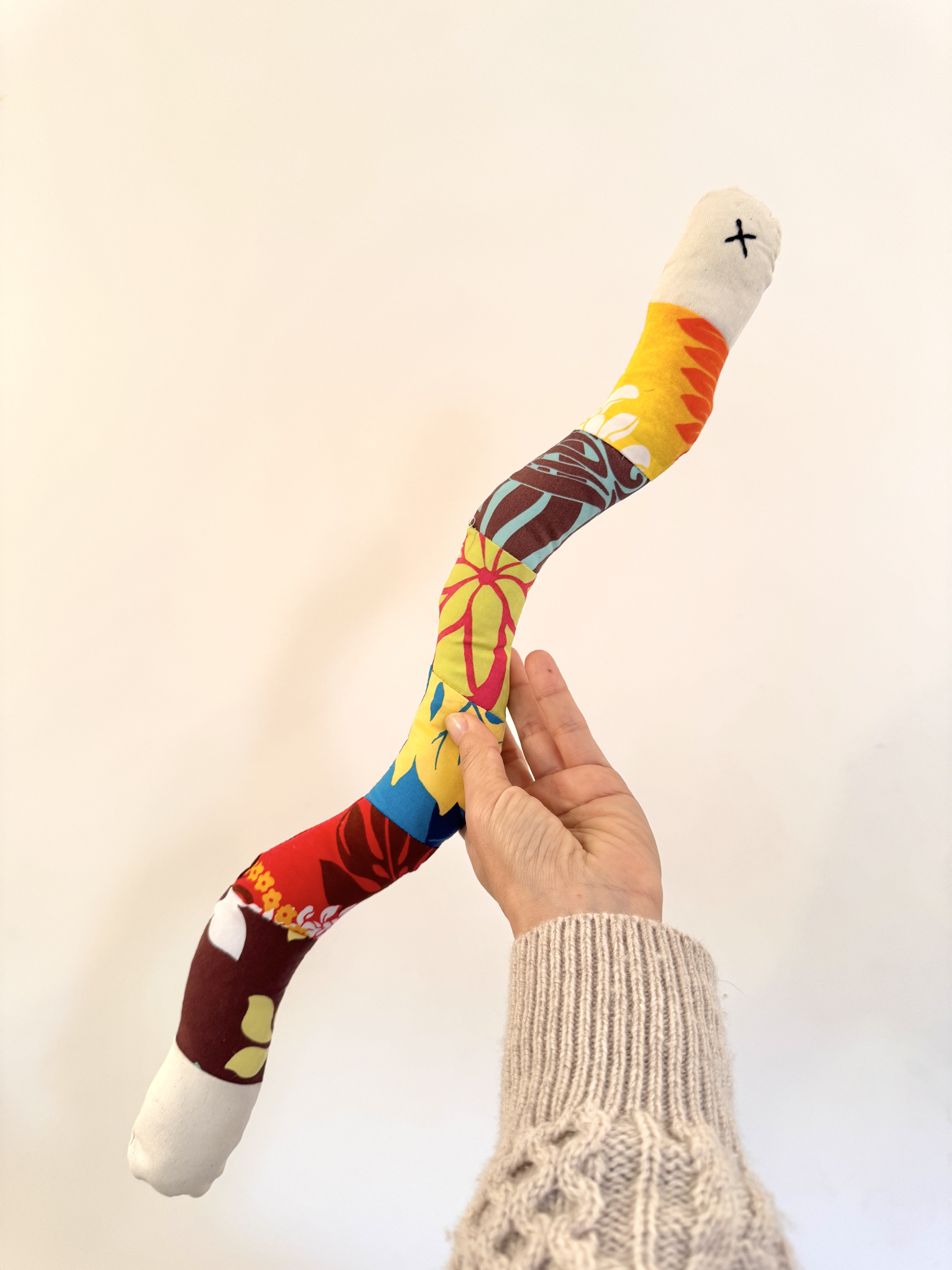 ハワイアンファブリックを切り取り、縫い合わせオリジナルの布を作りポップで元気の出る可愛い蛇ができました。頭にはまたたびの実を1粒。そしてしっぽには小さな鈴を忍び込ませてあります。