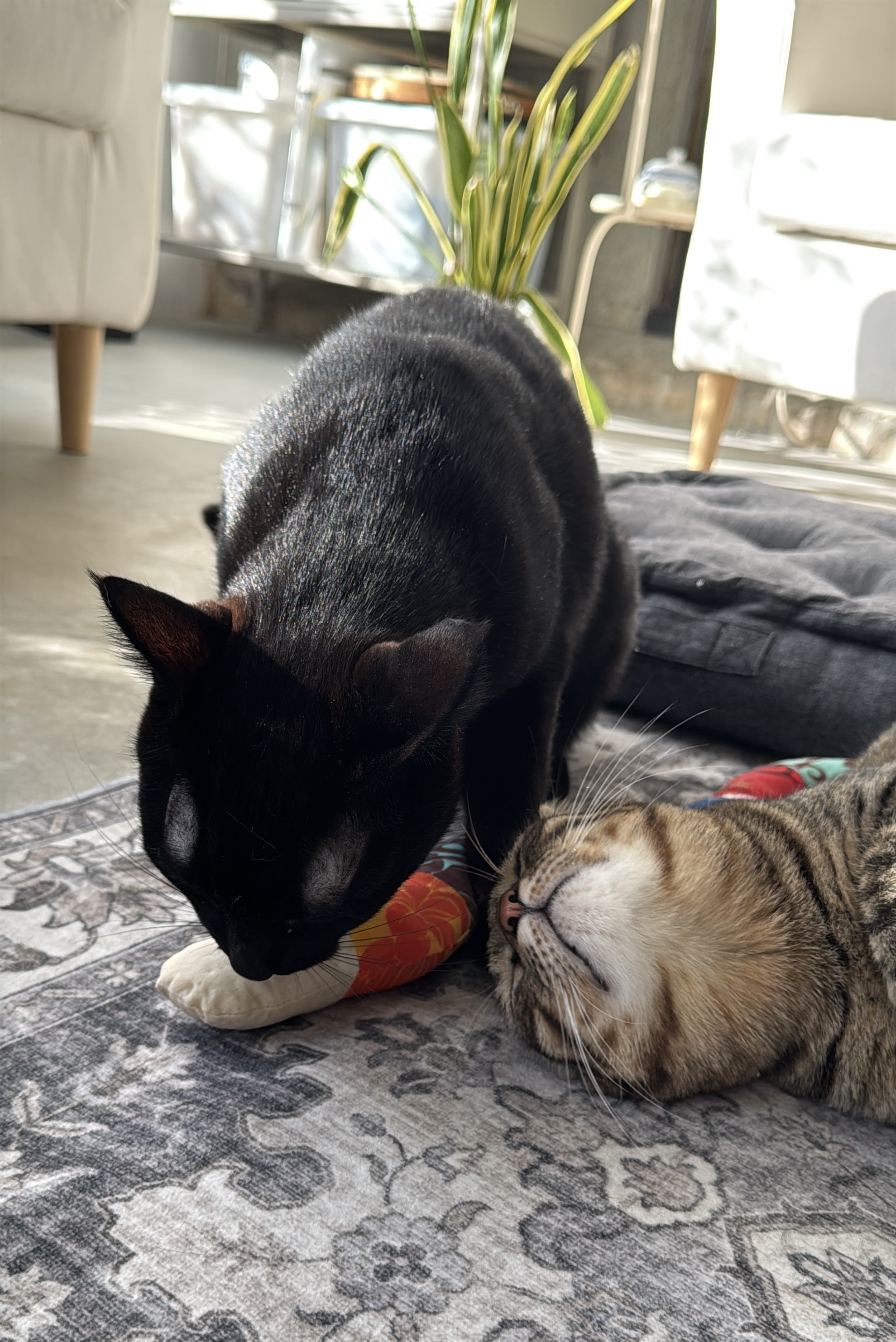 当店の猫グッズは、まず我が家の11匹の猫たちが使ってみて、本当に良いものだけを販売しています。今回の猫のおもちゃ(蹴りぐるみ)も、食いついたら離れないほどの人気ぶりです。